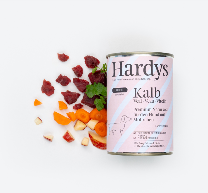Gesunde Ernährung von klein auf! Neben einer liebevollen Erziehung ist das Menü Hardys Junior ein gesunder Entwicklungsbaustein für Ihren jungen Hund.