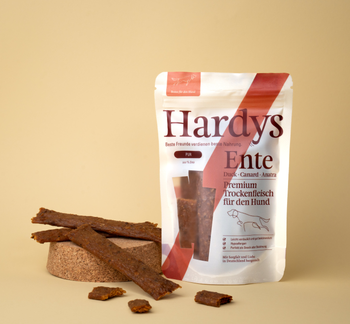 Hardys Leckerchen für Hunde sind reine Naturprodukte. Sie bestehen hauptsächlich aus getrocknetem oder gebackenem Fleisch von Wild, Pferd, Ente, Rind oder Huhn als einziger Proteinquelle.