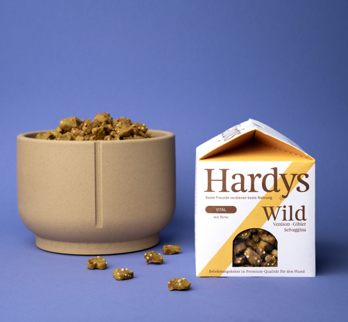 Ideal sind dafür zum Beispiel Hardys Belohnungskekse. Wir stellen diese Hundesnacks in drei Varianten her. Jede davon besteht aus einer einzelnen Proteinquelle. Die beiden Varianten “Wild und Birne” sowie “Rind und Hagebutte” sind klassisch gehalten und werden schonend gebacken. Bei der Sorte mit Huhn und Karotte haben wir noch wertvollen Hafer und Frischjoghurt hinzugefügt. Der Joghurt stärkt mit Kalzium und Eiweiß Knochen und Muskeln. Das enthaltene Kalium hilft, Flüssigkeit besser zu absorbieren und unterstützt so ein gesundes Herz- und Nervensystem.